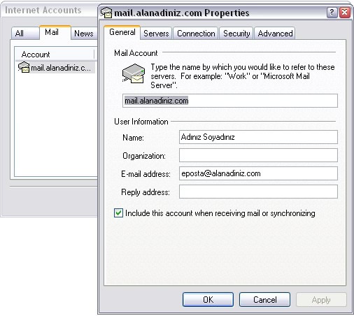 Hiçbir değişiklik yapmadan tekrar "OK" düğmesine tıklayınız. Ardından Apply düğmesine tıklayarak Properties penceresini ve en son Close düğmesine tıklayarak Internet Accounts penceresini kapatınız. Eğer hala e-postada sorun yaşıyorsanız Az önceki ekranın "Advanced" sekmesine geçiş yaparak "Outgoing Mail SMTP" seçeği yanında bulunan "25" nolu port numaranızı 587 ile değiştiriniz. | |