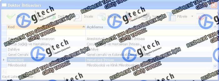 Doktor ihtisasları alanına çift tıklandığında açılan "Doktor İhtisasları" listeleme ekranı açılmış olur.