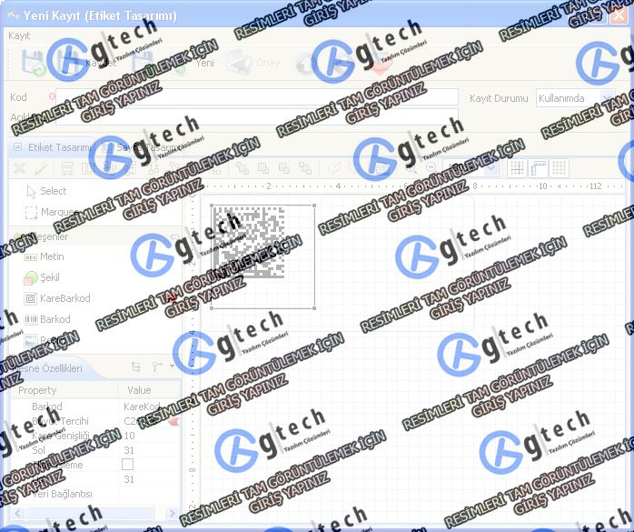 Etiket tasarımına Karekod eklemek için KardekodBarkod seçilir ve etiket üzerinde ne reye yerleştirilmek isteniyorsa fare ile yeri belirlenerek karekod eklenir. Karekodun boyutu istenilen ölçülerde ayarlanabilir. Ölç,lerini değiştirmek için  soldaki "Nesne Özellikleri" altında bulunan "Boyut tercihinden" hazır tanımlanmış ölçüler seçilebilir. Kardekodun kare genişlikleri de yine "Kare Genişliği" alanından elle değiştirilerek düzenlenebilir ve karekodbarkoda veri bağlantısı eklenebilir.