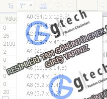 Sol sütünda yer alan bilgiler etiketin boyutlarını sağ taraftakilerde o ölçü ile A4 ( 21cm , 29,7cm ) sayfasına kaç adet etiket sığacağını gösterir.