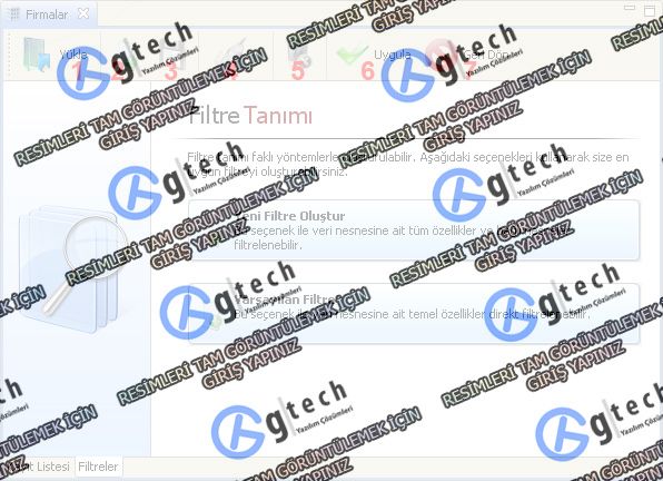 Filtre tanımızın kodunu ve açıklamasını varsa yetki kodunu da belirterek kaydedebilirsiniz. Yeni filtre tanımı yapmak için 2. simgeye tıklanmalıdır. Daha önceden oluşturduğunuz bir filtreyi uygulamak için 1. Yükle simgesi tıklanmalıdır.