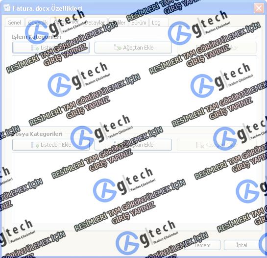 | "Dosya Özelliklerinde" 5 sekme bulunmaktadır. "Genel", Güvenlik", "Kategoriler", "Detaylar", "İlgililer" "Sürüm" ve "Log" sekmeleri Sistem yöneticisine ait alandır. Standart kullanıcılarda görünmez. |
